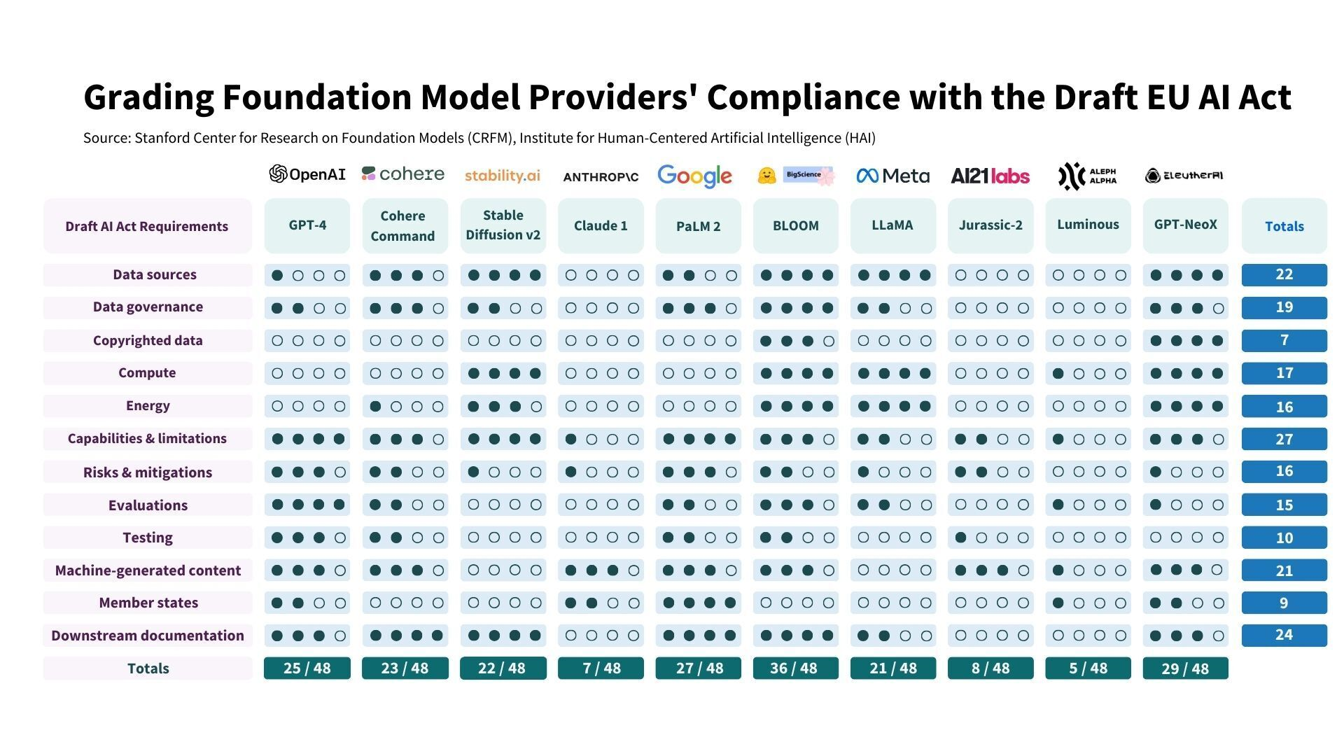 En fin, el reto seguirá siendo encontrar el balance entre seguridad y uso sin restricciones. Por un lado, seguimos escuchando a importantes expertos en la materia alertando acerca de la superinteligencia artificial que supera con creces a la inteligencia biológica (Es interesante escuchar a Geoffrey Hinton en Cambridge CSER “Two Paths to Intelligence”). Pero, por otro lado, el mercado europeo no puede ser tan restrictivo que espante a empresas innovadoras e inversores (y ya escuchamos al CEO de OpenAI sugerir que podría plantearse abandonar la UE). En este sentido Stanford Research ha llegado a publicar un interesante estudio anticipando cómo los grandes competidores en IA se encontrarían con respecto al cumplimiento (o no) con la norma.