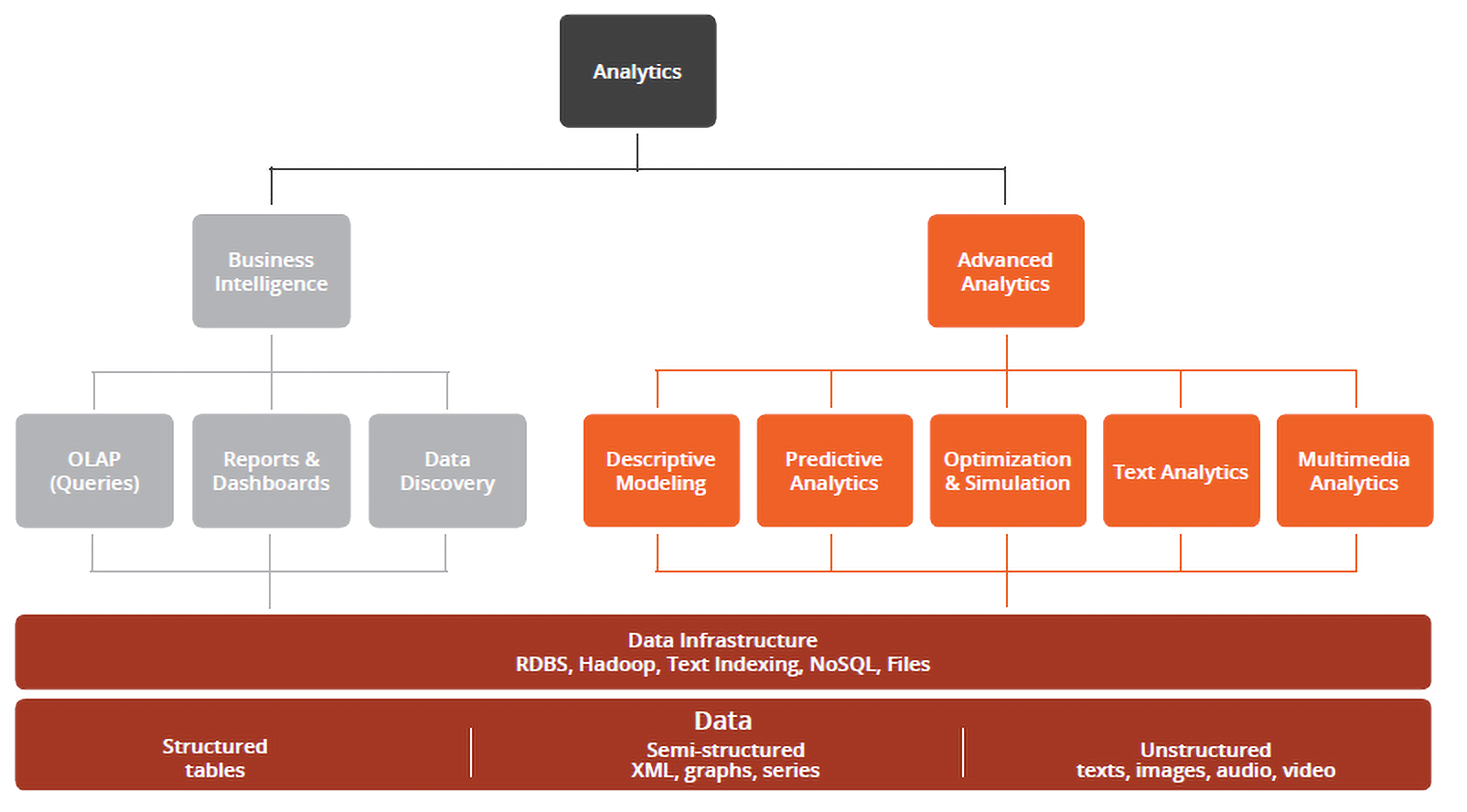Las analíticas incluyen dos áreas principales: inteligencia de negocio (Business Intelligence BI) y analíticas avanzadas (Advanced Analytics). Las tecnologías de Business Intelligence (BI) se han centrado tradicionalmente en el uso de un conjunto consistente de métricas para medir el comportamiento pasado y ayudar en la planificación empresarial. Se trata de realizar consultas, informar, procesar y obtener respuestas sobre lo que ha pasado y su frecuencia. Las analíticas de datos avanzadas utilizan técnicas de modelización complejas para predecir eventos futuros o descubrir patrones que no se detectan de otra forma. Estas técnicas pueden dar respuesta a cuestiones como la razón de un evento, lo que ocurrirá si no se modifica la tendencia, lo que ocurrirá o lo mejor que puede ocurrir. Existen tres niveles para las analíticas. En primer lugar, las analíticas descriptivas simplemente proporcionan formas para visualizar y explorar los datos como tales. En segundo lugar, las analíticas predictivas permiten obtener pistas sobre lo que puede ocurrir en función de las tendencias históricas. Finalmente, las analíticas prescriptivas incluyen técnicas de optimización basadas en grandes volúmenes de datos, reglas de negocio y modelos matemáticos para recomendar el mejor tipo de acción.